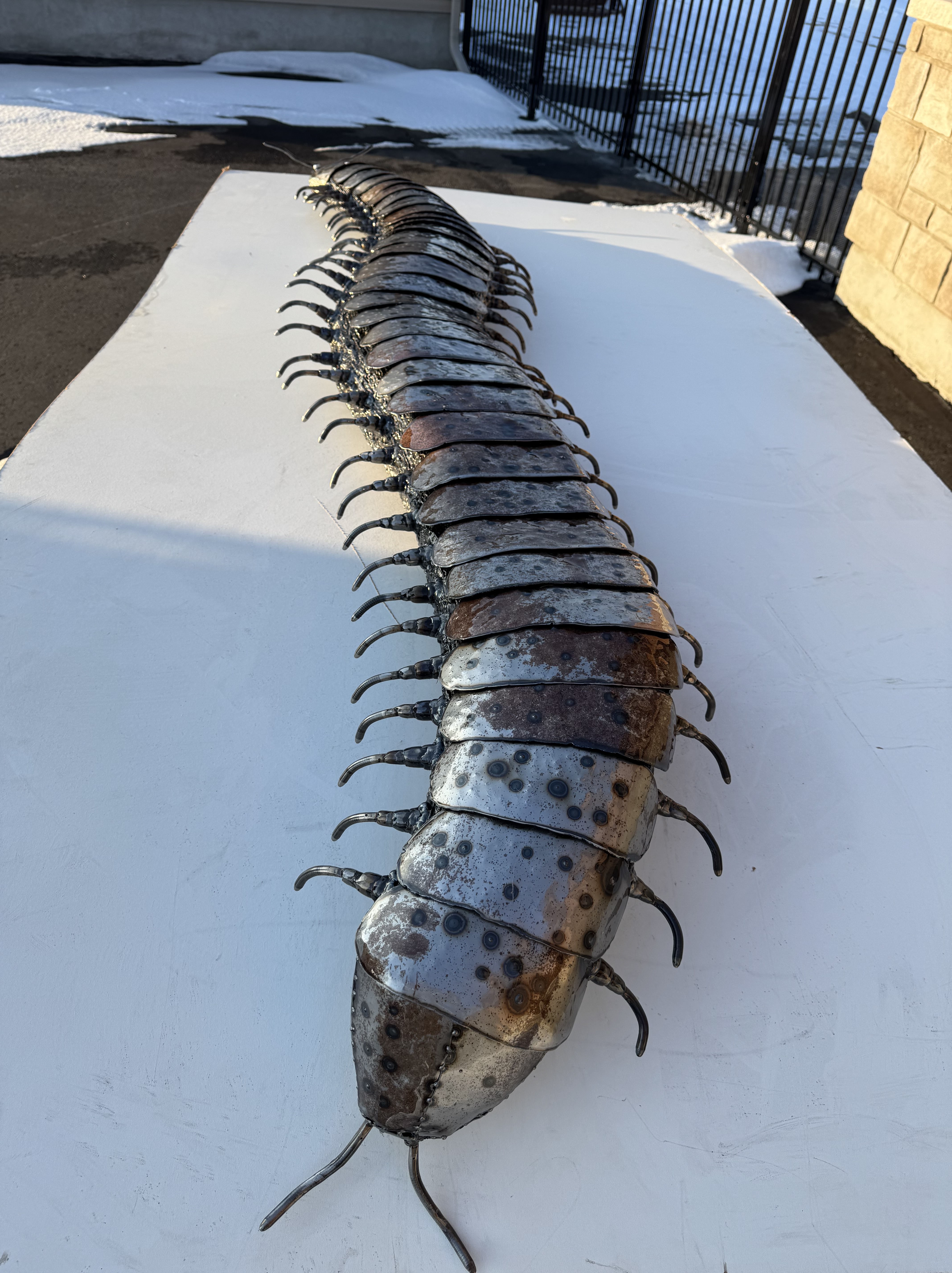This bold commissioned sculpture features individually formed segments and legs crafted from repurposed piano keys, blending industrial craftsmanship with musical history. Designed as a striking fireplace installation, it transforms metal into movement, character, and conversation.